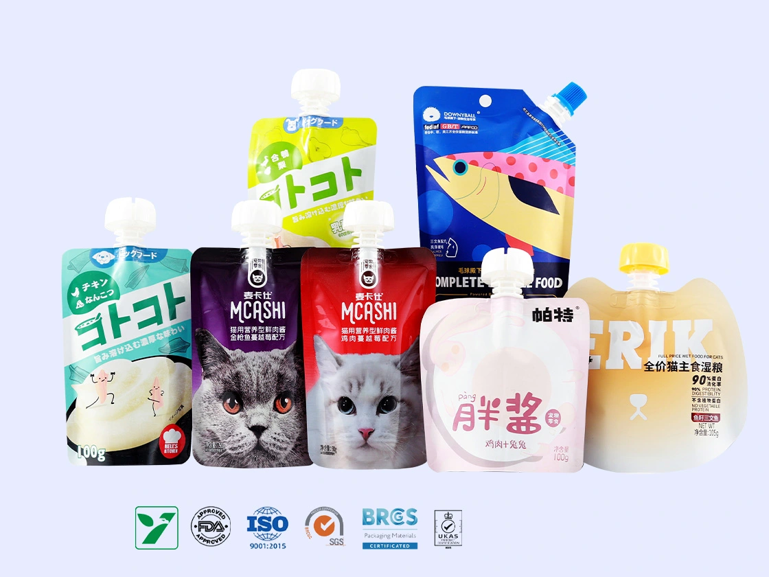 A pet food spout pouch is a flexible, lightweight packaging solution designed for wet or semi-liquid pet food. Featuring a built-in spout, it enables easy pouring and controlled dispensing while maintaining freshness. Made from recyclable Mono PP materials, these pouches prioritize sustainability without compromising durability or barrier protection. Certified for recyclability and food safety (e.g., BRC Grade A), they are ideal for eco-conscious brands seeking convenience and environmental responsibility.